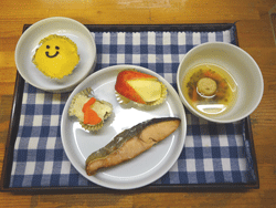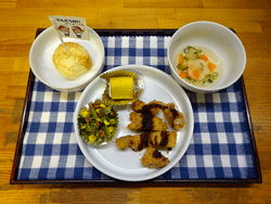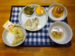 きんぎょ風ライス、鶏の照りマヨ、かぼちゃサラダ 春野菜のスープ、グレープフルーツ