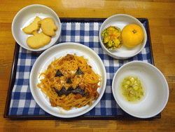 ミートスパゲティー、ハロウィンサラダ、スープ、みかん