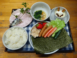 おばけごはん、豚しゃぶ、焼きとうもろこし、 夏野菜のみそ汁、ぶどう